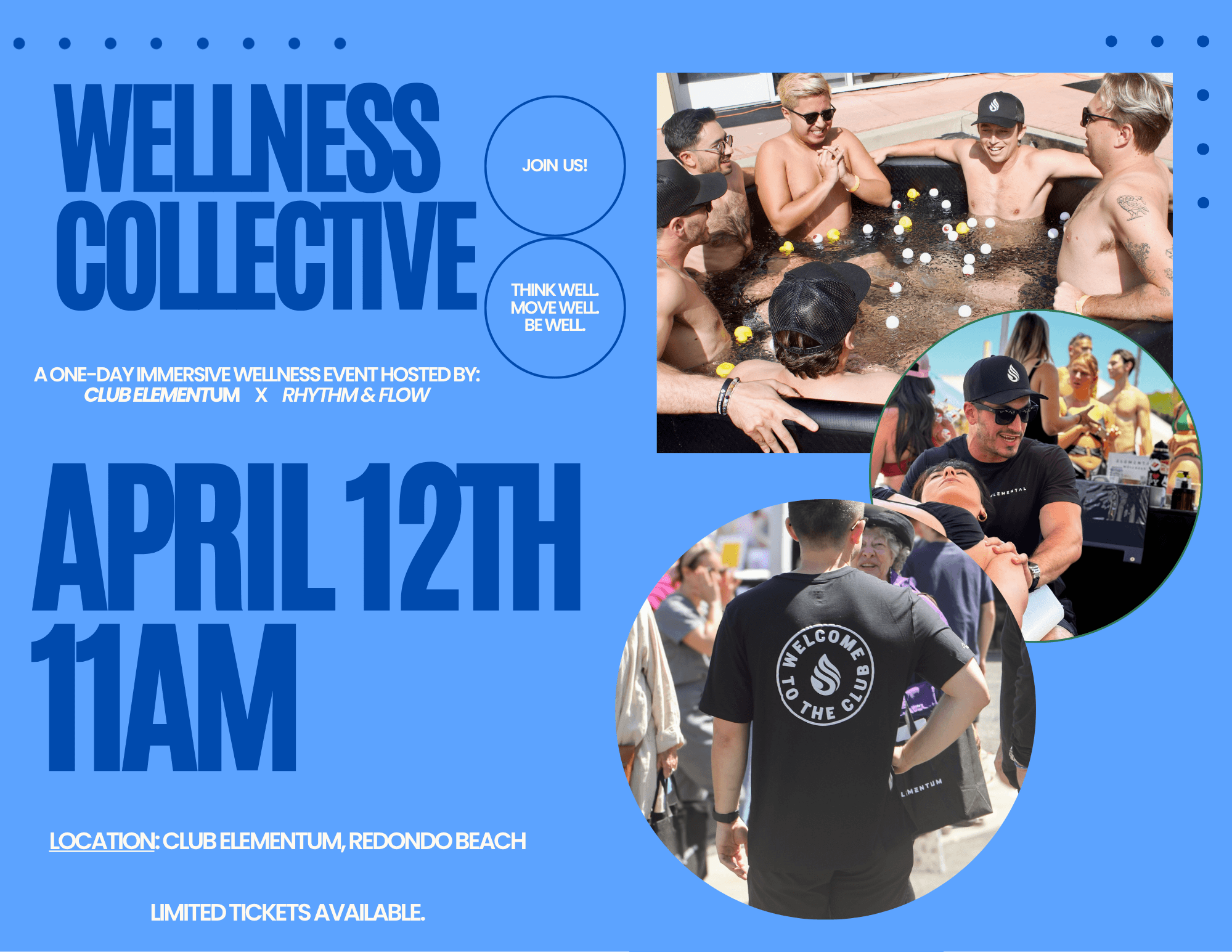 If you've been looking for a reason to actually prioritize your recovery, this is it. On Sunday, April 12, 2026, Club Elementum is teaming up with Rhythm + Flow to host the Wellness Collective — a community wellness event in Redondo Beach built around movement, recovery, and connection. This isn't a retreat. It's not a gym class. It's something in between — and it's happening right in your backyard.